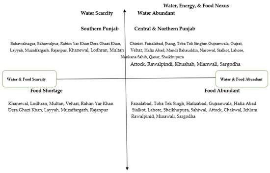 As shown in Figure 4, two distinct categories were created depending on the endowment of the WEF resources. There are fewer arable lands in the south in the food marketing areas such as Raheem Yar Khan, Dera Gazi Khan, Layyah, Muzaffargarh, Rajanpur, and Vehri. Punjab’s food production and production marketing were unbalanced, indicating that the country’s energy and food were not produced in the same places. Because energy and food production are water intensive, this posed a challenge to water consumption in these regions. In addition to using 70% of the world’s available water, traditional energy production also relies on local water consumption [40]. Inner Northern Punjab was also grappling with this problem.