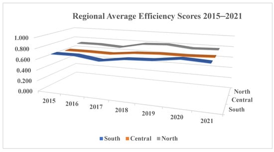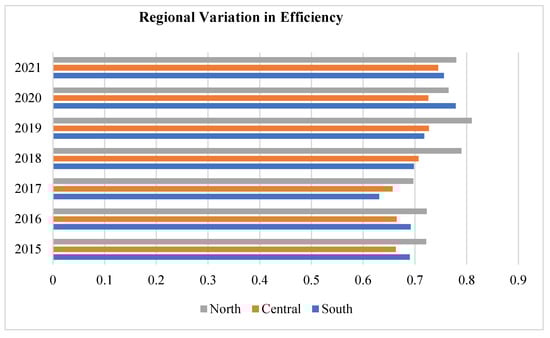 Figure 5 shows the real efficiency scores of each WEF nexus in each region. The central region deteriorated between 2015 and 2021, whereas all other regions grew rapidly from 2015 to 2021. There are many reasons for this, including the fact that the central region is a highly congested area that has experienced high population outflow and wastage of resources. Recently, it was found that the percentage of urbanization in the central Punjab increased. Efficiencies in the northern region are shown in Table 3 and Figure 5 and were the highest, indicating that resources were utilized in this region and also lowered their demand. The efficiency values in the southern region were slightly higher than those in the central region, consistent across the two regions, as a result of the divergence in national strategies brought on by the rise of Central Punjab. Figure 6 shows the average value of “real” input–output efficiency for each region.
