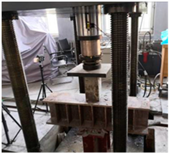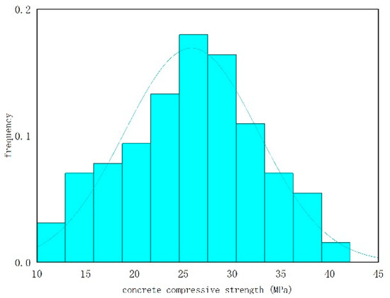 The schematic diagram of concrete compressive strength test is shown in Figure 3. The statistical test data are drawn as a histogram, as shown in Figure 4. According to the fitting curve of the histogram, the hypothesis that the compressive strength of concrete obeys the normal distribution is proposed. After hypothesis testing on the test data, it is concluded that at the significance level of 0.05, the axial compressive strength of concrete obeys a normal distribution with a mean value of 25.4 MPa and a coefficient of variation of 0.103.
