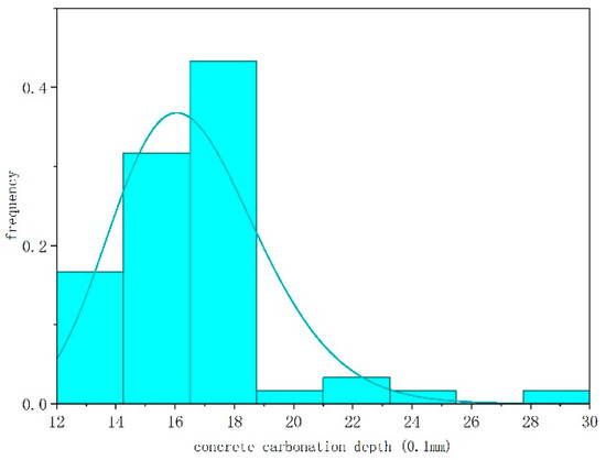 The carbonization of concrete has a significant impact on the properties of concrete materials and reinforcement materials. The determination of the depth of concrete carbonation is carried out in accordance with the “Technical Regulations for Testing the Compressive Strength of Concrete by the Rebound Method” (JGJT 23-2011) [5]. The test material is from the same batch of concrete as that of the bending test beam. We plot the concrete carbonization data as a histogram, as shown in Figure 5.