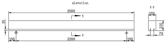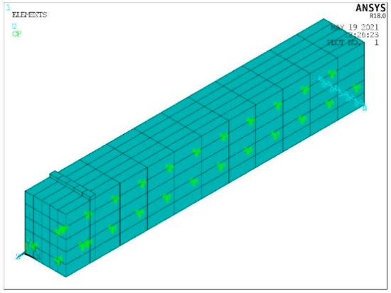 The finite element model is established according to the abovementioned material constitutive relationship and the size of the test beam. Since the structure is symmetrical with symmetrical loads, to simplify the calculation and to reduce the calculation error, a semi-structured finite element model is established. The established finite element model is shown in Figure 10.