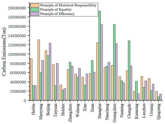 Thirdly, the comprehensive principle of carbon emission quota results from the perspective of equity and efficiency, which showed that the quota of the railway bureaus companies in western China (such as Qinghai–Tibet and Kunming) is smaller than that of the railway bureaus in east and central China (such as Shanghai, Beijing, and Guangzhou). This is due to the relatively developed economy, complete railway facilities, and high carbon emission efficiency of the railway bureau groups located in east and central China.
