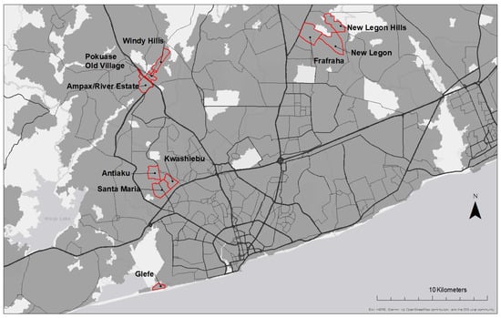 Location of neighborhoods covered by the survey. Source: Built-up area of Accra for 2017 produced following a method explicated in [43]. Road network data from OpenStreetMap.