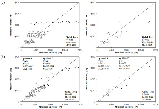 Predictive models for (a) < 6000 cP—Inputs: k, , T, t, RC, and (b) > 6000 cP—Inputs: k, T, t, RC.