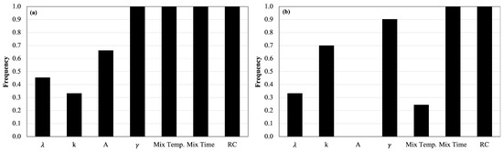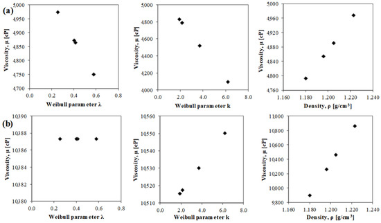 As reported in Table 1, 600 equations were developed for every generation of the analysis. The frequency of occurrence of each variable was calculated (frequency equal to one indicates that all equations contain that variable). The results of the sensitivity analysis are illustrated in Figure 3. The mixing time and rubber content had the most dominant effect on the CRM binder viscosity prediction, followed by the mixing temperature and rubber density. The gradation also played an important role in forecasting the viscosity values. None of the equations for viscosity above 6000 cP considered the surface area. As mentioned in the previous section, high-viscosity values are usually recorded for a high rubber content, which may be a condition in which the surface area could lose its significance. The effect of a single parameter on viscosity can also be analyzed by a parametric study. Figure 4 illustrates the impact on the forecast viscosity due to the variation in the rubber density, Weibull parameter , and k. The parametric study of the surface area is not shown for the reason mentioned above. The effect of the gradation changed considerably in the two scenarios, whereas the rubber density had the same effect. However, the inherent randomness of the MGGP algorithm did not allow for the control of or force the effect of a given parameter in order to have the desired trend, and the algorithm optimized the prediction models as a result of the superposition of all the effects of the variables analyzed.