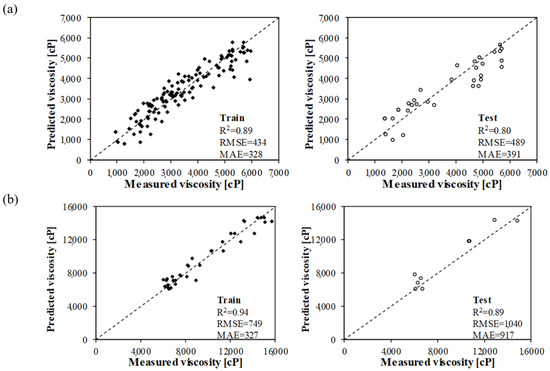 Preliminary results of binder viscosity prediction using the (a) MLSR and (b) MGGP models.