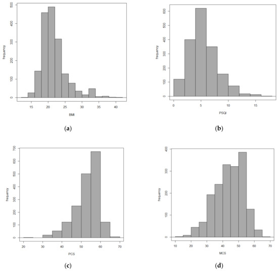 The distributions of participants’ BMI, PSQI, PCS, and MCS are shown in Figure 1a–d, respectively. The bar charts in the figure show that the BMI, PSQI, PCS, and MCS data were all evenly distributed. The quartiles of these data are listed in Table 2.