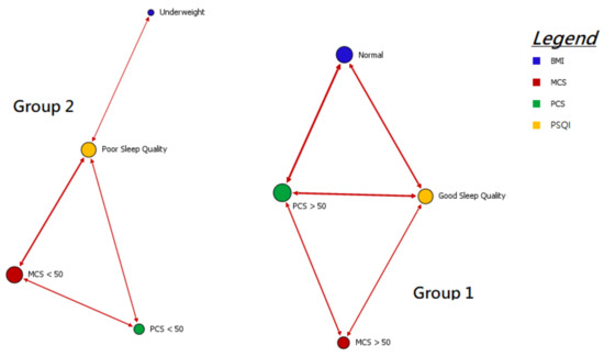 The association rule analysis is conducted using PolyAnalyst 6 software (Megaputer Co. Bloomington, IN, USA). The categorized PSQI, PCS, and MCS scores of the BMI groups were imported to PolyAnalyst. A high significance between the variables could be demonstrated and visualized as a link pattern.