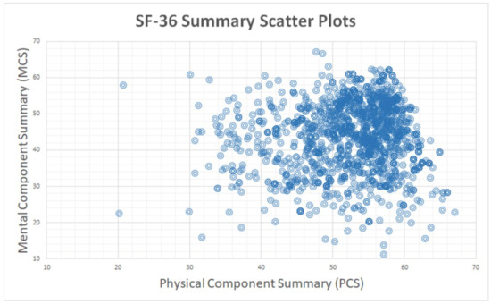 Other commonly used data clustering methods, such as K-means clustering, require advance knowledge on the number of clusters or the distribution of data. However, these methods are ineffective when little difference is present in the data. Moreover, they are ineffective when little difference is present between data dimensions. For example, when the MCS and PCS data, which are of similar dimensions, were converted into an x-y two-dimensional distribution diagram (Figure 3), the two groups could not be distinguished from the diagram. Moreover, because the R-square of linear regression line was 0.0035, MCS and PCS were obviously not positively correlated. Thus, previously applied data analysis methods are unable to show any clearly distinguishable clustering patterns for the data, which is their limitation. Association rule analysis, however, can identify the distinction from the links of sample characteristics and can rapidly visualize the links, which is convenient.