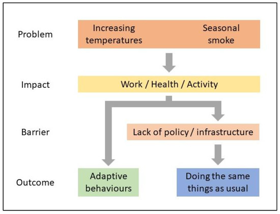 There was a common perception among participants that it was getting hotter and that increased local temperatures impacted their work, health, and activity. Seasonal smoke also impacted their work, health, and activity. Adaptative behaviors were used by participants because of hotter temperatures and decreased air quality from seasonal smoke. A lack of policies around increased temperatures and seasonal smoke and of appropriate infrastructure were perceived as barriers that resulted in work practices and sporting activities not adapting to environmental changes (i.e., doing the same things as usual), which ultimately had health and activity implications. Figure 2 shows the relationships between these themes.