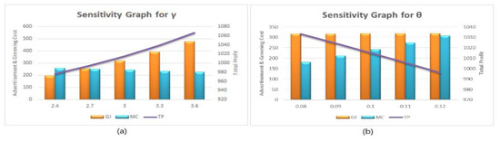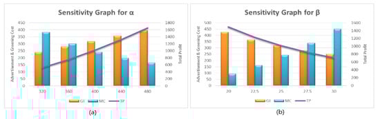 In the literature, most research has been carried out by considering either remanufacturing, redesigning, recycling, costsharing, carbon reduction, or carbon trading as a greening policy. In our work, we considered organic farming where the grocer avoids the use of inorganic fertilizers and pesticides. From Figure 2, it can be noted that the greening investments increase in relation to an increase in the constant demand, while they decrease in relation to an increase in the price sensitivity factor. A decrease is observed in advertisement cost, with an increase in , and the advertisement cost increases with an increase in . From Figure 3a, it can be concluded that, with an increase in , greening investments increase, advertisement cost shows a marginal decrease, and total profit increases. Figure 3b shows that, with an increase in , advertisement cost increases, and the total profit decreases. However, there is no change in the greening investment cost.
