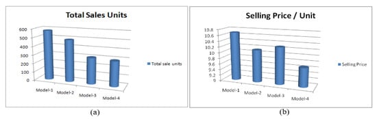 Figure 4 shows the change in total sales and selling price per unit for models 1–4. Total sales volume is very much affected by advertisement and greening efforts. The selling price of the product decreases if we do not use advertisements or a greening policy.
