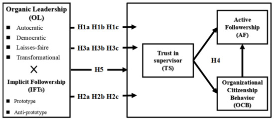 Past literature has related research on leadership and trust in supervisor (TS) [14,19,27]; leadership and organizational citizenship behavior (OCB) [16,17,18,19,28]. However, there is no article that integrates these variables to discussing the relationship among interactions of organic leadership (OL) and implicit followership (IFTs), trust in supervisor (TS), active followership (AF), and organizational citizenship behavior (OCB). Even less focuses on the perspective of followers, as a result, based on the acceptance theory of authority [8] and concept of organic leadership [10], for better understanding the work attitudes of remote workers under the influence of different leaders’ interactions, the purpose of this study was therefore to examine the impact of the interaction of leadership and followership (remote workers) based on followers’ perception (OLIF) on OCB and AF with the mediating role of TS. Understanding this relationship could help to enhance the employee’s OCB and active followership.