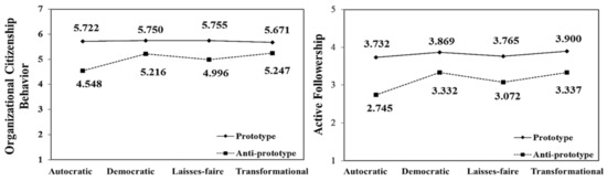 The influence of OL on OCB when IFTs are anti-prototype traits, under Autocratic leadership style, its influence on OCB will be significantly less than Democratic (MAuto-cratic = 4.548, MDemocratic = 5.216; T = −3.750, p < 0.05), Laisses-faire (MAutocratic = 4.548, MLaisses-faire = 4.996; T = −2.477, p < 0.05), and Transformational (MAutocratic = 4.548, MTransfor-mational = 5.247; T = −3.926, p < 0.05); H3b is supported.