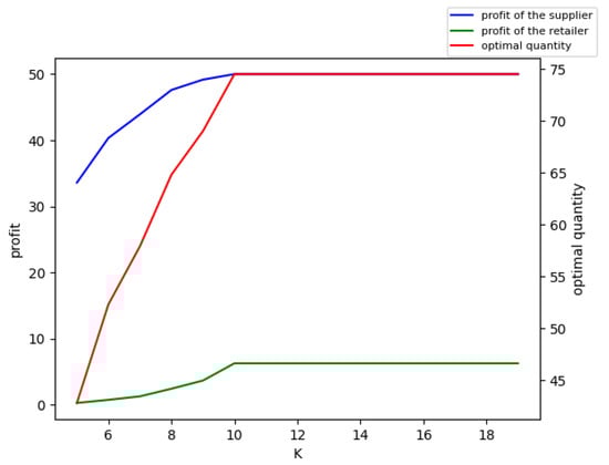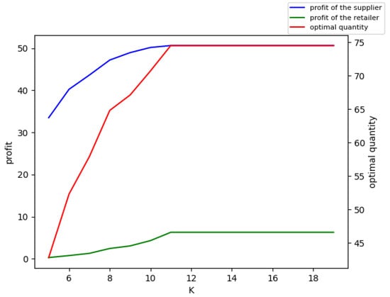 From Figure 3, we can see that before reaching their maximum values, the profit of the supplier, the profit of the retailer, and the optimal quantity all increased with the increase in the initial capital of the supplier.