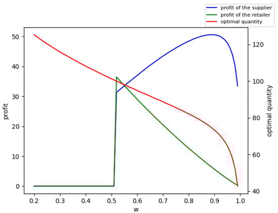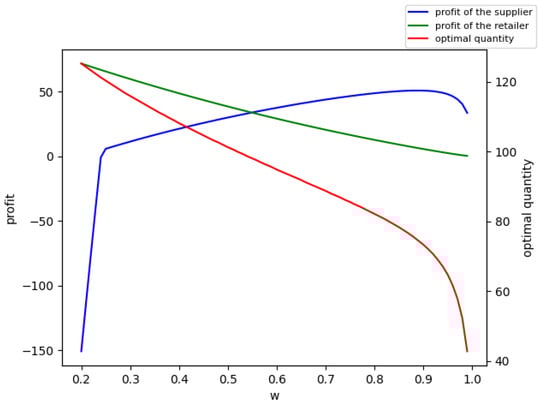 From Proposition 1, we see that with the increase in the wholesale price, the optimal quantity for the retailer decreases. So, if the target of the supplier is to maximize the sales quantity, he should offer a low wholesale price. From Corollary 1, we see that when the marginal cost is so low that , with the increase in the wholesale price, the total revenue that the supplier can obtain first increases, and after the wholesale price becomes higher than the threshold , the revenue decreases. If the supplier wants high revenue in a certain season, setting the wholesale price as may be a good idea.