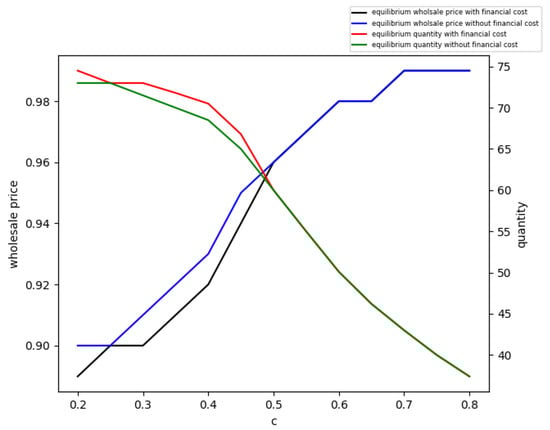 From Proposition 5, we see that if the supplier faces potential financing costs, he may increase the wholesale price; thus, the retailer will order less. In other words, the potential financing cost decreases the scale of trade in some cases and does not affect the scale of trade in the other cases. The effects of the marginal cost on the equilibrium solutions are shown in Figure 8.