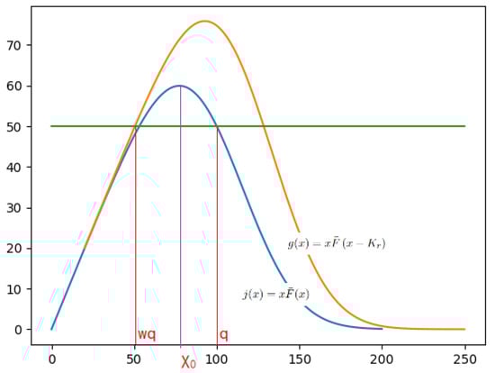 We illustrate these results in Figure 2; referring to the previous research [], we assumed the market demand D∼ (normal distribution with mean = 100 and standard deviation = 30), with and .