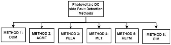 The majority of fault detection systems in the DC side of a PV plant can be classified into one of the methods described in this section as shown in Figure 1. These methods differ in terms of the types of faults detected, the types of measurement sensors required, the most practical application for the proposed method, and the method used to generate the test results, such as whether a simulated computer-aided method or purely experimental validation was performed to present the results.