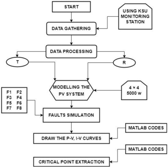 The flowchart of processes that passed through is introduced in Figure 2. In addition, each subsection will clarify the stages starting with the data-gathering stage, passing through the system modeling stage, the fault simulation stage, and, finally, the AI model configuration stage. Matlab and Simulink were utilized to build a 5 kW PV system and simulate the studied faults.