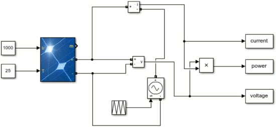 Simulink provides great features that enable users to simulate such physical systems. A solar panel can be simulated as well. A PV solar panel has two inputs, which are radiation (R) and temperature (T). The output voltage (P), current (I), and voltage (V) are worked out. Moreover, the P–V relation and the I–V relation can be plotted and these curves change by changing the weather conditions.
