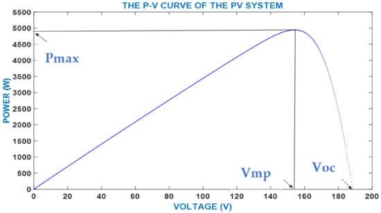 Figure 4 shows the proposed model for the PV system. The output of the PV system is simulated in order to plot the P–V and I–V curves. These curves are important to check whether the system suffers from a fault or not. Their importance will also help later on in order to differentiate between the types of faults. Figure 5 and Figure 6 show these important curves.