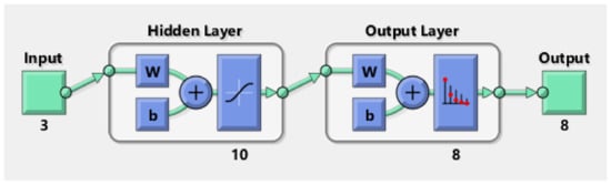 The ANN logarithm has to be trained using previously collected data. Three scenarios were created according to the number of inputs which were: the maximum power (Pmax), the open circuit voltage (Voc), the short circuit current (Ish), the voltage at the maximum power (Vmp), the current at maximum power (Imp), radiation (D), and temperature (T). It is identified in the previous section how these parameters were extracted from the P–V and I–V curves. Figure 8 shows the logarithm configuration and Table 11 illustrates the three scenarios’ details.