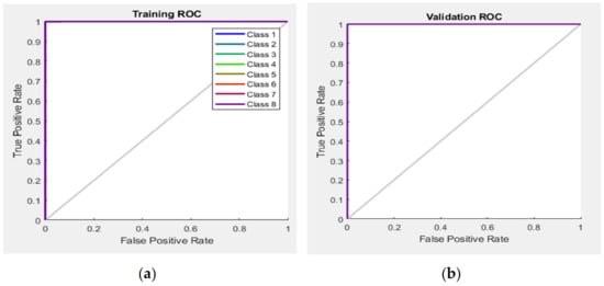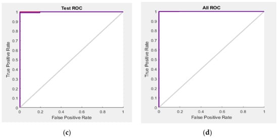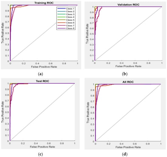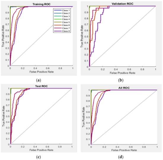 The receiver operation curves (ROC) of the first scenario illustrated in Figure 16 are very important to check in order to assess the logarithm performance. They show that the ANN achieves good results in most classes of faults except F6, F7, and F8. These results were achieved by figuring out the area under curves. As the area under the curve becomes bigger, the performance is better. The receiver operation curves for the second and the third scenarios are shown in Figure 17 and Figure 18.
