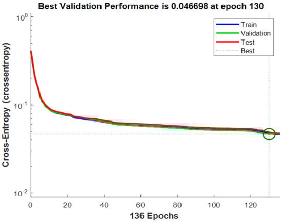 The plot shown in Figure 19 illustrates that the curves decline to reach a point of stability. This point meets a cross-entropy of 0.046638 which achieves the best validating at an epoch number of 130. The dynamic of the three curves shows good fit learning curves also the small gap between the curves emphasizes the same result. The plots for the second and the third scenarios are shown in Figure 20 and Figure 21.