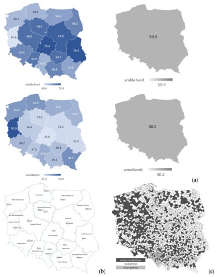 National land use in Poland as a percentage of the total as of 1 January; data as of 2020 (a); voivodships in Poland (b); rural–urban, rural, urban gminas in Poland (c). Source: own study based on BDL CSO data.