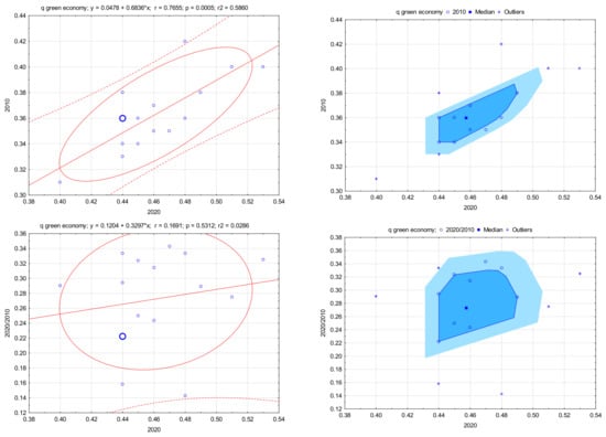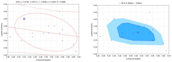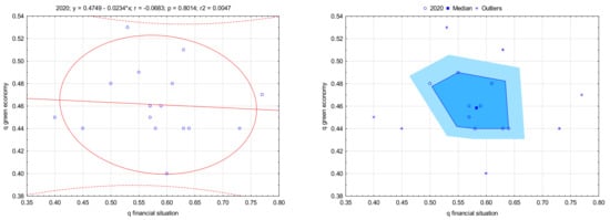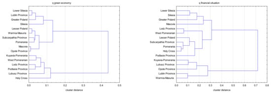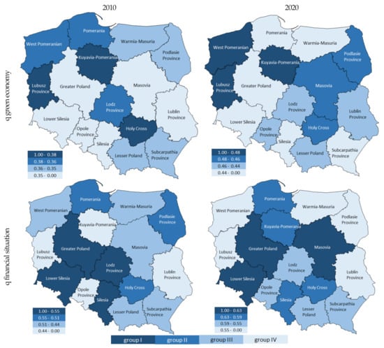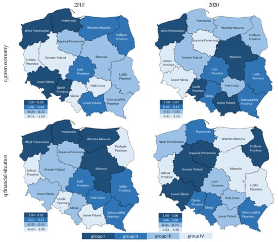 The green economy and financial situation were described by means of the variables illustrating, among others, resource management; the conservation of biodiversity; the sustainable consumption and production model; renewable energy sources; energy and material efficiency; income, expenditure, and financial surplus aspects; and subsidies. The subject of spatial dependencies was dealt with, among others, by Kopczewska (2006) []. The determinants of the operation of voivodeships are interactive. They should be seen as a set of interdependent elements that occur in the same time and space horizon. A green economy impacts, among others, the quality of life of inhabitants, reducing the risks to the natural environment and ecological shortages. It is described by variables describing the state of the natural environment, such as production efficiency; the relations between the natural environment, economy, and society; the quality of life of the population; and the instruments of impact on the economy and society. The main role in this respect is played by the necessity to carry out the qualitative transformations of the processes and to relieve the burden on the physical environment [].