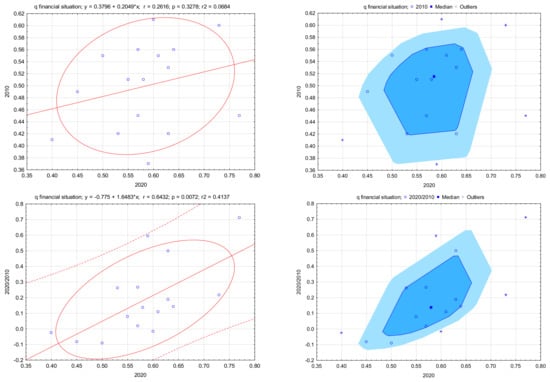 The analysis of the coefficients of variations and the correlation matrix led to the conclusion that the selected variables were slightly correlated with the others. All the variables (as shown in Table 1) for the analysis were characterized by sufficient discriminant ability. The values of the coefficients of variations ranged from 0.14 (X4) to 1.01 (X2) (in the case of the financial situation, from 0.31 (X24) to 0.94 (X21)) in 2010 and from −1.76 (X7) to 1.75 (X5) (in the case of the financial situation, from −0.36 (X16) to 2.08 (X23)) in 2020. It should also be noted that the variables were characterized by a positive asymmetry (X4, X7, and X12 in 2010 showed a negative asymmetry, while in 2020, no negative correlation was found; in the case of the financial situation, this was observed in 2010 between X14, X16, X15, X17, and X19 but none in 2020), which in the case of the stimulants is not a favorable situation, as it means that a greater number of municipalities have values of these variables lower than their average value (Table 4).