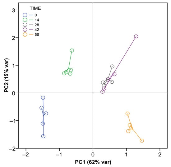 | F(4,20) | p-Val | Day 0 | Day 14 | Day 28 | Day 42 | Day 56 | |