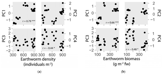 | Earthworm density (individuals m−2) | 254.9 | 7.5 × 10−17 | 345 d ± 23 | 434 c ± 40 | 877 a ± 34 | 889 a ± 27 | 665 b ± 46 |