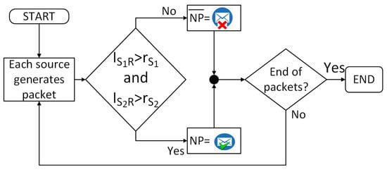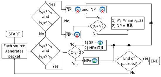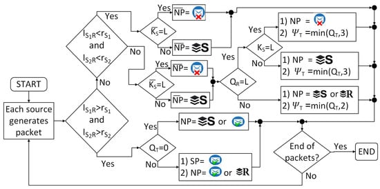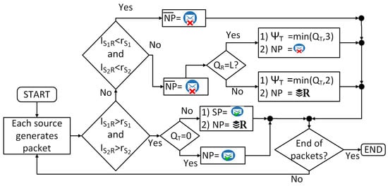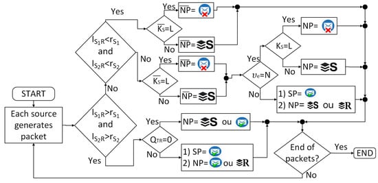 - If both links are available, the packet generated by is sent to the destination, or is sent to the relay to be stored, or is stored in according to the capabilities of the buffers of and of R. The same happens with the packets that are generated in the node .