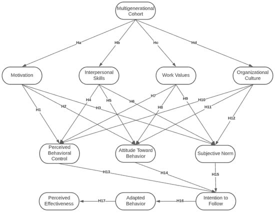 Under the TPB, the factor of intention is assumed to predict one’s behavior to the extent that an individual is capable and has actual control in performing said behavior [52]. On the other hand, adapted behavior is learned to achieve the community standards of the same generational cohort [53]. Evaluating what motivates the intention of the different multigenerational cohorts would lead to positive adapted behavior and present effectiveness in an organization. In this study, perceived effectiveness pertains to leaders’ ability and perception of handling people bringing a positive or persuasive impact. Thus, it was hypothesized that: