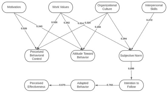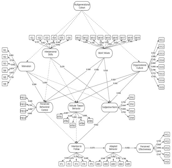 The initial SEM model for the perceived effectiveness of multigenerational management leadership and metacognition among the service industry in the Philippines is shown in Figure 2. As shown in the model, several hypotheses were determined to be insignificant, namely, Managerial Cohort (Ha to Hd), Motivation to Subjective Norm (H3), Interpersonal skills to Perceived Behavioral Control (H4), Attitude toward Behavior (H5), Perceived Behavioral Control to Intention to Follow (H13), and Attitude toward Behavior to Intention to Follow (H14). The above hypotheses were removed (p-value > 0.50; indicator < 0.50) from the revised Structural Equation Model, being insignificant from the model following the suggestion of Hair [64].