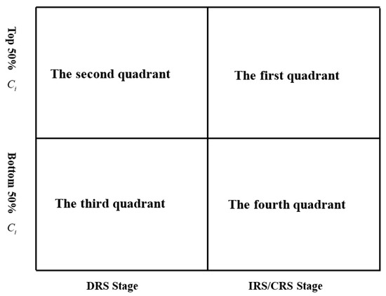 Taken together, indicator and RTS are considered to reasonably estimate and analyze the sustainability of LUE. To further make sense of the findings, a four-quadrant classification is developed, as shown in Figure 2. In this classification, inefficient cities are divided into two proportionally equal groups according to the ranking of indicator ; further, the cities can be classified into two groups according to RTS stages. Note that cities in the IRS and CRS stages are in one group, and others in the DRS stage are in another group. Finally, a four-quadrant classification is developed for sustainability analysis.