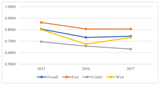 The dynamically changing trend of LUE reflects its sustainability. Figure 3 displays the dynamic changes in efficiency. During the observed period, the overall average efficiency of major cities shows a fluctuating decreasing trend. It declined from 0.8051 in 2015 to 0.7324 in 2016 and then rose slightly to 0.7430 in 2018. This high volatility reveals that the sustainability of LUE is in a weak state. In terms of area, the average efficiency value of the western area shows the same trend, decreasing from 0.8010 to 0.6744, and then rising to 0.7322, while that of the eastern and central areas declined. Specifically, in the eastern area, the value dropped from 0.8626 to 0.8062, and then declined slightly to 0.8056. In the central area, the value fell from 0.6953 to 0.6571, and then declined slightly to 0.6314. In terms of the amplitude of variation, as a whole, the efficiency change was smaller in the eastern cities (0.0570) than in the central cities (0.0639) and western cities (0.0688).