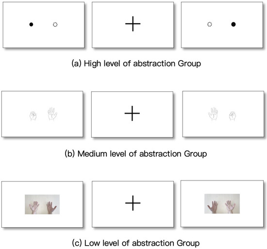 The experiments used the classical Graz paradigm of asynchronous MI experiments [41]; BCI research has frequently employed this paradigm. To lessen the impact of visual residuals on MI and to better match the scenario to the actual application, the paradigm mandates that subjects perform the MI task after watching the visual guidance and that they do not perform visual guidance while performing the MI task. In the research on brain science and semeiology, specific brain regions such as the hippocampus change while watching symbols and stimuli with different levels of abstraction [42]. In psychological research, different moving stimuli have different abstract memory representations [43]. Since our MI tasks were under the guidance of visual stimuli, we took the abstraction level of visual guidance as the breakthrough point. During the experiment, participants were required to complete three different types of visual guidance MI tasks at various levels of abstraction: (1) high level of abstraction, which employed an abstract guide to cue left- and right-hand gripping based on the motion of a ball; (2) medium level of abstraction: a more abstract guide that used line drawings of hand grasp animations to cue left- and right-hand grasping; (3) low level of abstraction: a nonabstract (figurative) task that cued the left and right hands using real-world hand grip animations. The three types of cues are shown in Figure 1, where the cues in the medium and low abstraction groups are shown in the first view. In the experiment, participants were instructed to maintain a relaxed state throughout, view one of the three cues, and then visualize the left and right hands holding an object on a blank screen after the signals had vanished. The cues were animated and occurred randomly.