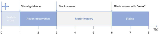 Experimental timing diagram. A single-trial experiment took 8 s to complete and had 4 phases: a 1 s preparation phase, a 2 s viewing guidance phase, a 3 s motor imagery phase, and a 2 s rest phase.