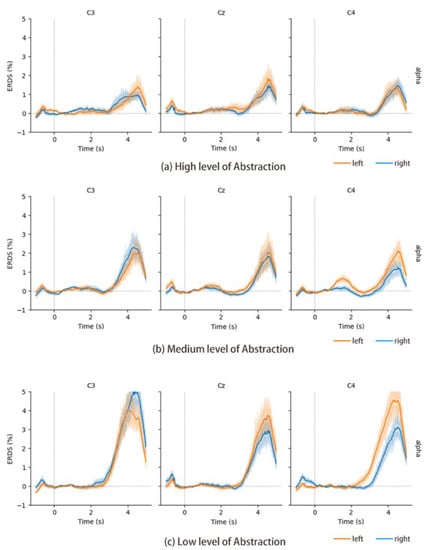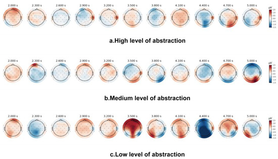 The central region of the brain contains human sensorimotor-related regions, and MI tasks cause the central region to become active. As shown in Figure 13, in the middle and late period of motor imagery (3.5–5 s), the brain’s alpha wave showed high activity. As the level of abstraction decreases, the activity of alpha waves in the central area of the brain increases. Based on the findings mentioned in the Results section, it is hypothesized that participants will be able to complete MI activities and exercise more easily the less mental load there is in the central area of the brain. Additionally, the imagery is more classifiable.