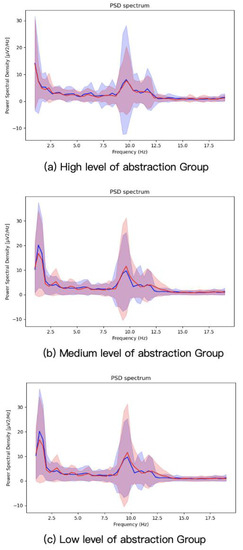 Two metrics were utilized in the analysis to evaluate H2, which states that users’ cognitive load is connected to their level of abstraction of visual guidance. The PSD of each frequency band and channel were extracted using frequency domain analysis. Through statistical analysis, it was discovered that the average mental load of the group with a low abstraction level differed significantly from the mental load of the group with a high abstraction level. In contrast to the other two groups, the subjects in the group with a high level of abstraction had to switch the primary body throughout the cognitive process to translate the ball’s movement into the hand’s movement. Such a mental process will almost certainly result in some mental burden.