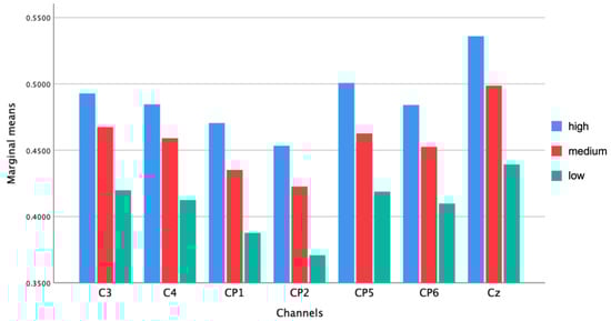 Ke et al. [52] discovered considerable variations in the theta and alpha band energies for various task kinds and levels of difficulty. To calculate the ratio of the average PSD of the theta wave to the average PSD of the alpha wave during the time window of motor imagery (3–6 s of the single trial), we extracted seven electrode channels distributed in the central region: C3, C4, Cz, CP1, CP2, CP5, CP6. Their descriptive statistics are shown in Table 3. On three levels of abstraction of visual guidance, the ratio of the theta wave mean PSD to the alpha wave mean PSD during motor imagery was calculated (high, medium, low) with repeated measurements for the seven EEG channels (C3, C4, Cz, CP1, CP2, CP5, CP6). The independent variables were the abstraction levels of the visual guidance and the EEG channels. The dependent variables was each subject’s mean theta/alpha band energy ratio.