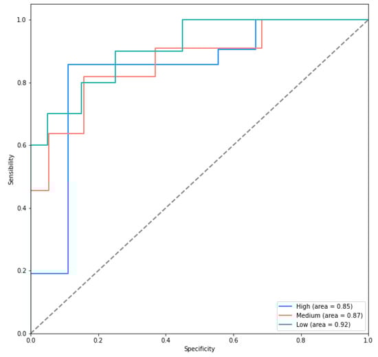 Table 4 displays the accuracy of motor imagery categorization under the visual guidance of individuals with various levels of abstraction. The highest classification accuracy of the group with a high level of visual guidance abstraction was 90.7143%, and the average accuracy was 85.2381%; the highest classification accuracy of the medium-level visual guidance group reached 90.7143%, and the average accuracy was 86.5294%; the highest classification accuracy rate of the low-level visual guidance group was 97.1429%, and the average accuracy was 90.5732%. Figure 7 shows the analysis of the classification model by the ROC curve. Figure 8 demonstrates that the low-level abstraction of the visual guidance group’s experimental findings had a greater average categorization accuracy than the other two levels of abstraction of visual guidance. The classification accuracy of motor imagery under the three levels of abstraction of visual-guided paradigms was tested pairwise using paired-samples t-tests (high, medium, and low).