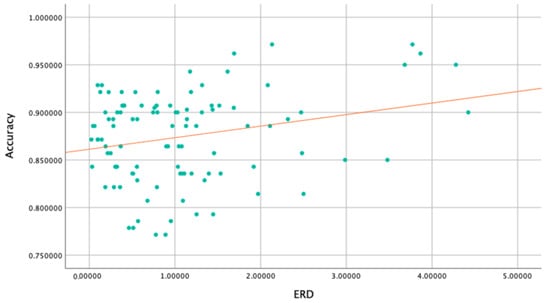 We explored the relationships between the ERD values in the central area of the brain, which represents brain activity, and the MI-BCI performance and the two measurements of mental load. Pearson’s correlation coefficient for the investigation of the relationship between the ERD values in the central area of the brain and the accuracy rate was found to be r = 0.249, p = 0.012 < 0.05. This indicates that the ERD values in the central area of the brain and the accuracy rate have a positive correlation (see Figure 9). More brain activity improves the classification accuracy and functionality of MI-BCI.
