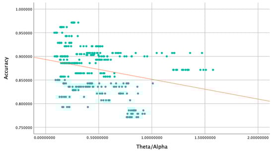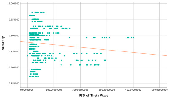 In the correlation analysis between the PSD of the frontal theta wave and the accuracy rate, the Pearson correlation coefficient of the obtained results was r = −0.109, p = 0.007 < 0.05. It is inferred from this that the PSD of the frontal theta wave has a negative correlation with the accuracy rate. In the correlation analysis between the ratio of the PSD of the theta wave and alpha wave in the central area and the accuracy, the Pearson correlation coefficient of the obtained result was r = −0.278, p < 0.001. It is inferred from this (shown in Figure 10 and Figure 11) that the ratio of the PSD of the theta wave and alpha wave negatively correlates with the accuracy. The lower the ratio of the PSD of the theta wave to the alpha wave in the central area, the higher the classification accuracy and the better the performance of MI-BCI.