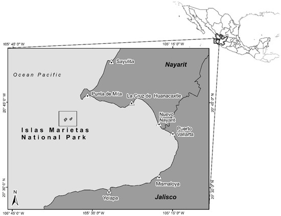 Overview of whale-watching tourism. Humpback whales (Megaptera novaengliae) are a highly migratory species that exist in all the world’s oceans; these marine mammals have specific areas for feeding during spring and autumn, particularly in waters of medium and high latitudes. Later in the winter, the humpback whales migrate to breeding areas in the tropics [25]. From November to March, humpback whales are found on the Pacific Coast of Mexico; they congregate at the south end of the Baja California peninsula, around Isla Isabel, the Tres Marias Islands, and Bahía de Banderas [1,26].