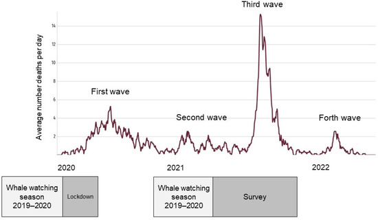 Timeline of the COVID-19 pandemic and whale-watching seasons in Bahía de Banderas, Jalisco-Nayarit. The 2019–2020 whale-watching season was conducted normally. All navigation was restricted between 30 March and 1 June 2020 [45]. However, Mexico never closed its borders to international flights, so the 2020–2021 whale-watching season took place after the reopening of navigation and during the second wave of the pandemic (source: own elaboration based on [28,45]).