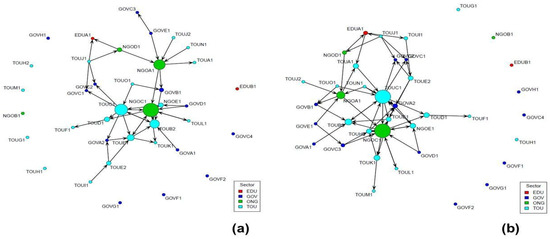 Visualization of the whale-watching tourism collaboration network: (a) before the pandemic (2020–2021 season), and (b) after the second wave of COVID-19 (2020–2021 season). The nodes represent the participants and the lines of their collaboration ties. The size of the nodes represents the betweenness centrality of the stakeholders. The first three letters of the label of each node indicate the sector to which they belong: tour operators (TOU), government agencies (GOV), non-governmental organizations (NGOs), and universities (EDU).